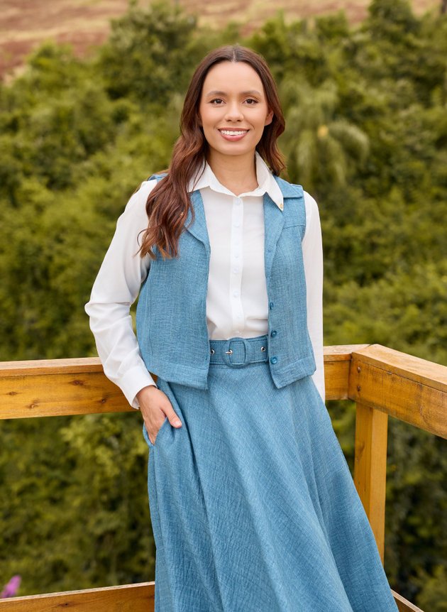 Colete Carla modelo com gola camisaria costurado em tecido duplo com recortes em alfaiataria, modelo cavado sem mangas com fechamento em botões, seu comprimento fica na altura da cintura perfeito para usar sozinho ou com sobreposições, uma peça versátil e atemporal que traz jovialidade e informação de moda ao look.