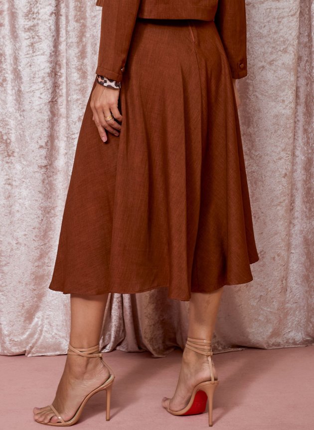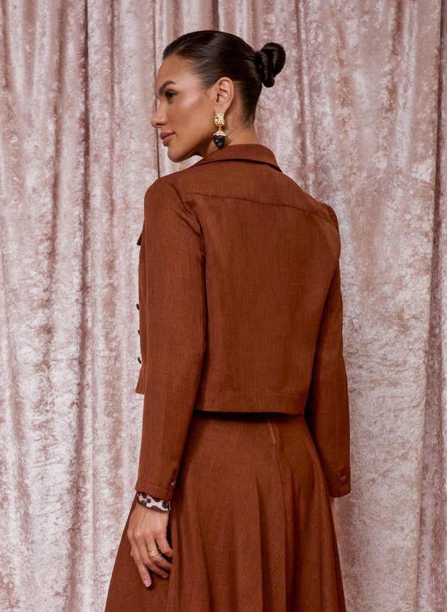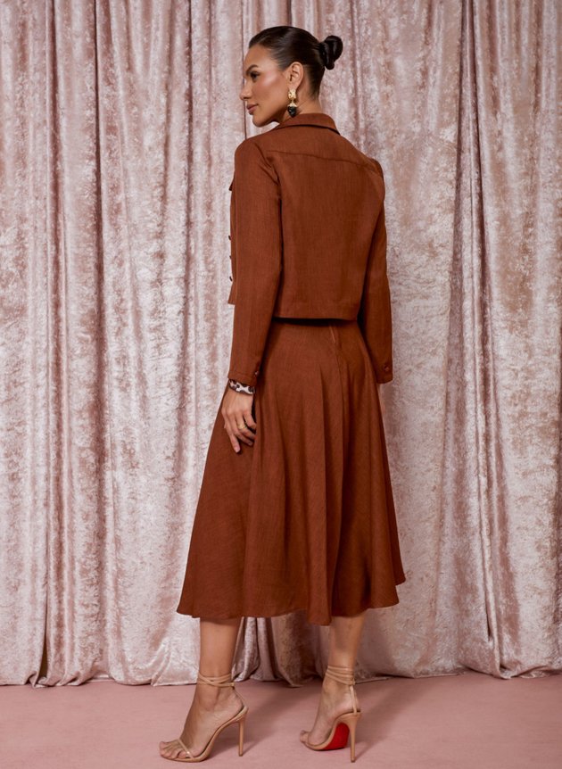 Conjunto Magda na cor marrom, confeccionado em alfaiataria berlin um tecido com caimento impecavel perfeito para a proposta do look, composto por casaqueto e saia. Sendo o casaco em manga longa, gola costurada em tecido duplo e fechamento em botões encapados, sua saia max midi godê com cós médio fechamento em zíper e bolso faca embutido nas laterais, é toda forrada em helanca na cor preta, acompanha cinto. A versatilidade dos conjuntos é de serem usados tanto juntos quanto separados montando uma diversidade de propostas dependendo de sua maior necessidade.