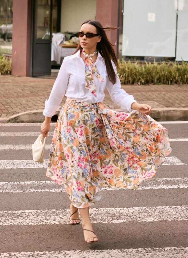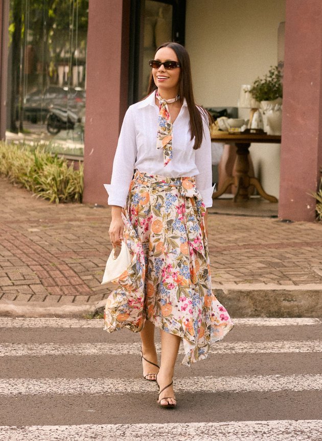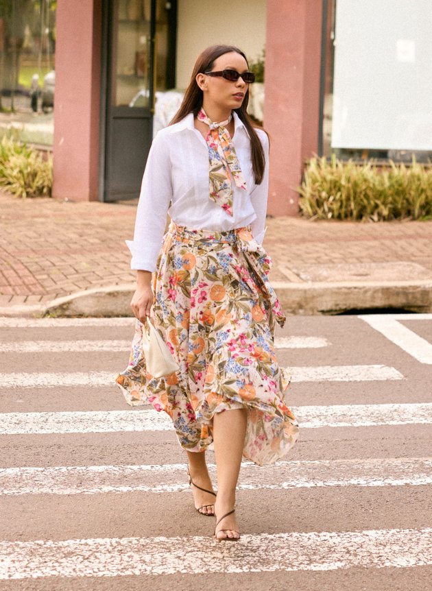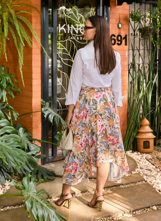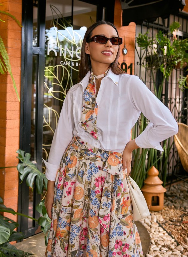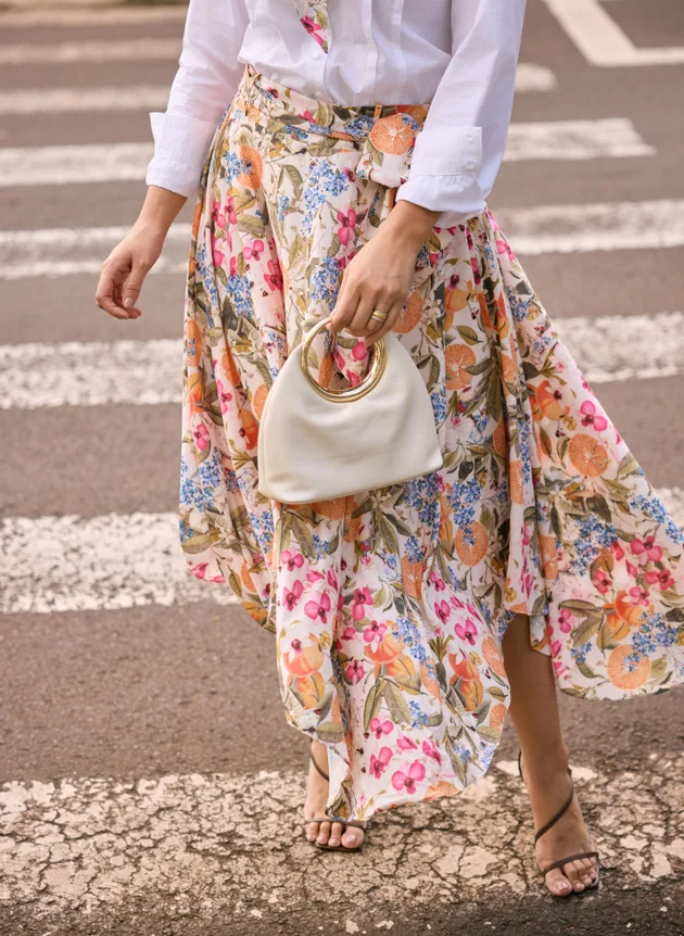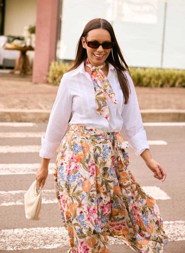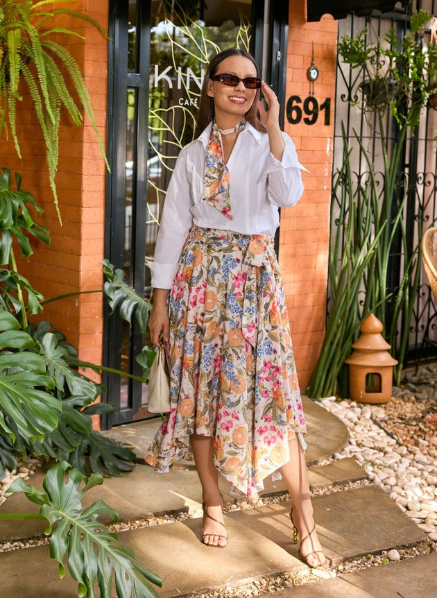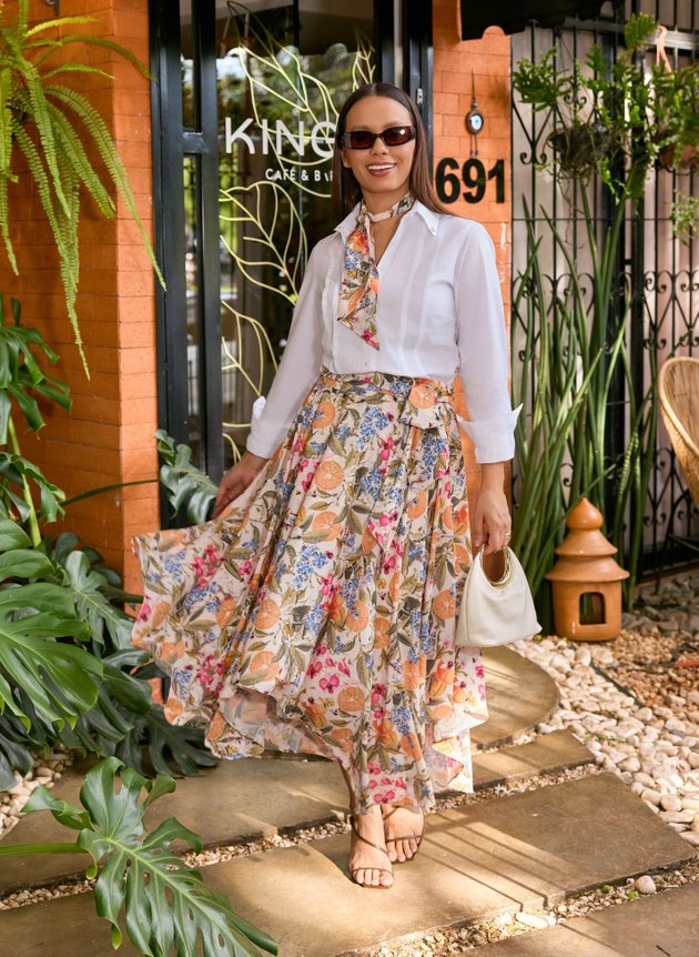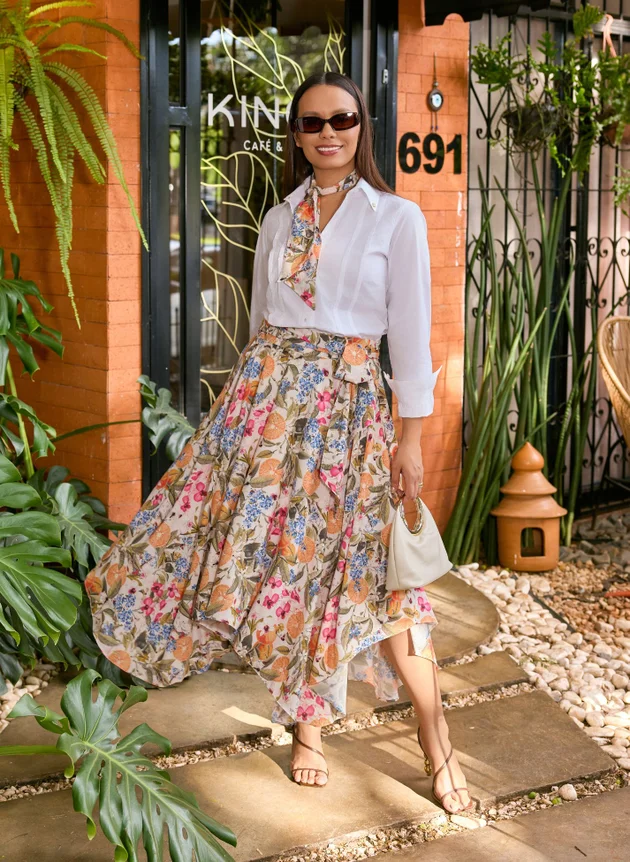 Uma saia com barra assimétrica, toda forrada em helanca off, trazendo conforto e segurança ao uso. Destaque para sua estampa tropical que mistura elementos de frutas, flores e borboletas em uma harmonia perfeita de cores, combinamos com uma camisa branca trazendo mais modernidade ao look, mais ele pode facilmente ser combinada com outras peças, se adequando ao seu estilo.