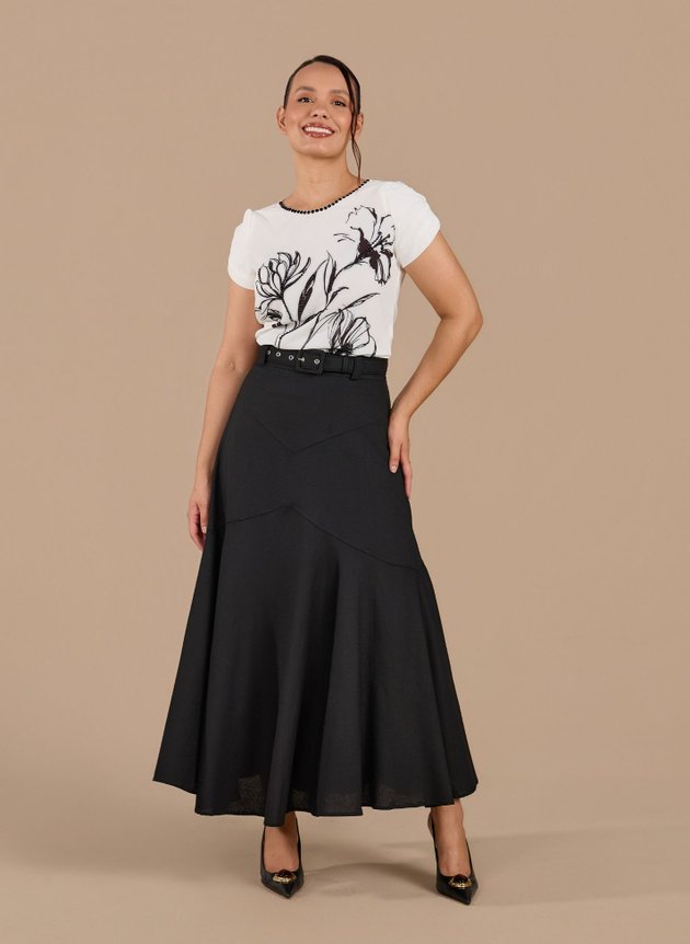 Saia confeccionada em viscolinho na cor preta com cós médio costurado em tecido duplo com passantes e abertura em zíper comum na parte posterior das costas. Acompanha cinto encapado com fivela quadrada, saia modelo evasê com recortes se encaixando perfeitamente ao corpo, de comprimento mais alongada esse modelo possui um caimento impecável com um barrado no godê, claro que sua cor preta possibilita diversas composições. Um modelo elegante e atemporal, toda forrada em toque de seda trazendo ainda mais conforto e segurança ao uso.