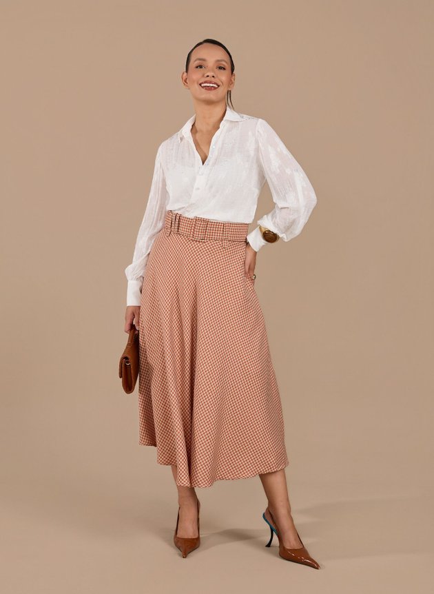 Saia Katiely confeccionado em tecido de Pied Poulle Alfaiataria, um tecido mais estruturado com caimento perfeito para a proposta do look, modelo com cós largo e passantes acompanha cinto encapado com fivela quadrada. De fácil uso possui abertura em zíper comum na parte posterior das costas, de comprimento maxi midi é uma peça toda forrada em helanca na cor off, trazendo conforto e segurança ao uso, modelo com bolso faca embutido nas laterais trazendo funcionalidade a peça. Seu recorte godê traz movimento e sofisticação para o look que pode facilmente ser usado com diversas propostas de looks, sejam mais casuais ou mais formais, com botas, saltos ou mocassins é uma peça que exala bom gosto.