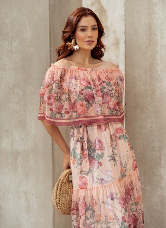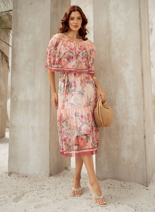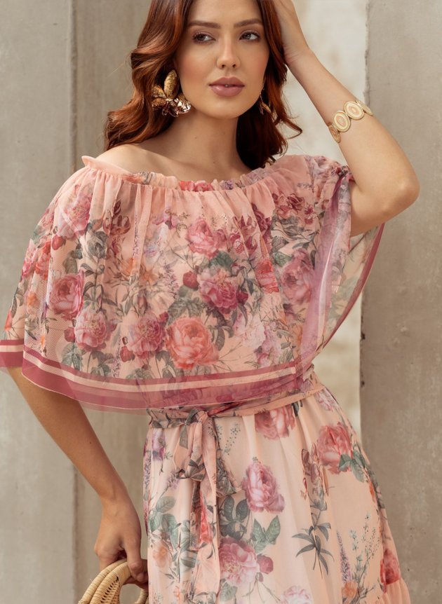 Vestido Eloá confeccionado em tecido de tule, um tecido leve e fluido perfeito para a estação. Modelo com decote canoa, podendo ser usado de forma tradicional ou ombro à ombro, com um babado largo sobreposto ele traz um charme extra ao modelo e permite conforto e segurança ao uso, já que o mesmo tem uma modelagem regata perfeito para o verão. Não possui abertura em zíper ou botões, mais sua cintura marcada em elástico facilita a vestimenta, acompanhando faixa para amarração. Sua saia midi evasê toda forrada em toque de seda na cor off possui um recorte com um barrado franzido trazendo ainda mais movimento e um caimento impecável ao vestido. Corpo da peça também é todo forrado em toque de seda, um modelo atemporal, confortável e cheio de romantismo, prático e de fácil uso já que o tule não precisa ser passado à ferro. Destaque para sua estampa exclusiva em flores e folhas com acabamento na barra em listras tanto no babado da barra, quanto no babado sobreposto sobre o decote adicionando um charme extra. Podendo ser usado em diversas ocasiões e estações do ano. Para maior durabilidade da peça, evite o uso de alvejantes.