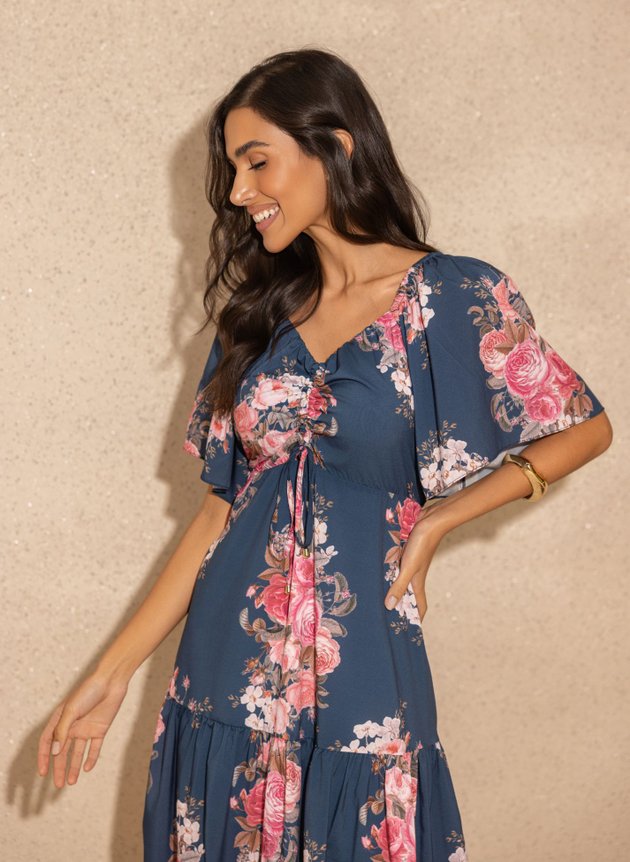 Vestido Lariele confeccionado em toque de seda modelo com decote coração e elástico nas laterais dos ombros trazendo sustentação para o modelo, que possui regulagem no franzido do busto. Detalhe para sua manga raglan ampla e confortável trazendo um charme extra para o modelo, com um caimento perfeito ao corpo ele possui lastex nas costas e elástico na parte posterior da cintura. Sua saia na altura do joelho toda forrada em helanca off trazendo conforto e segurança ao uso, de modelagem evasê com um recorte na saia em um barrado largo no godê franzido trazendo movimento para a peça, destaque para sua estampa floral em tons de rosa e marrom que casaram perfeitamente com o azul de funcho, um modelo delicado e atemporal que pode ser usado em diversas ocasiões e estações do ano, sejam em ambientes mais formais ou mais casuais use a criatividade no acessórios para deixar com a sua cara e arrasar em seus compromissos.