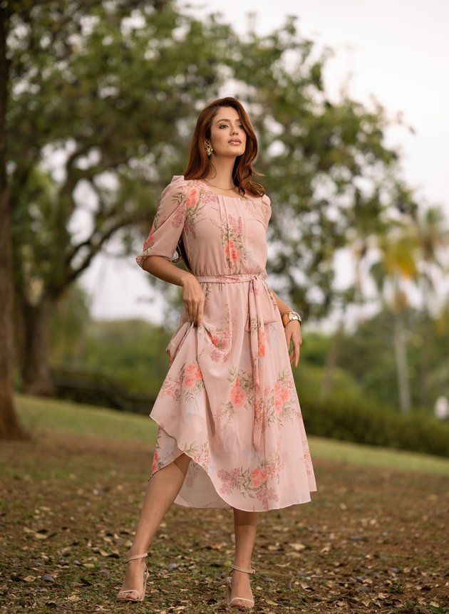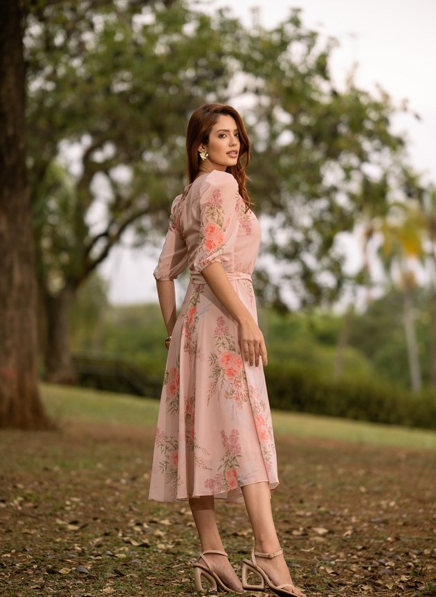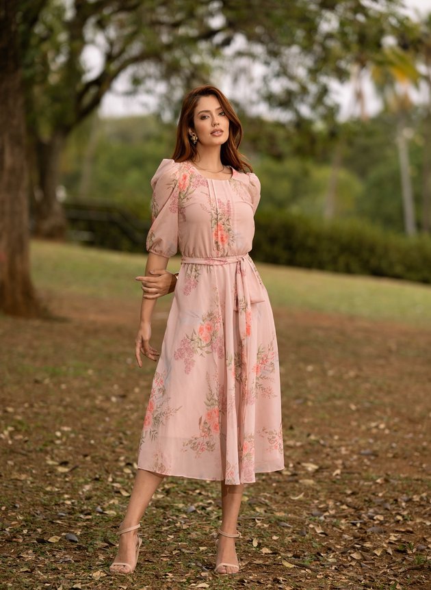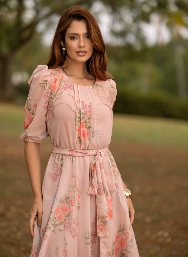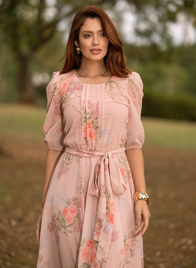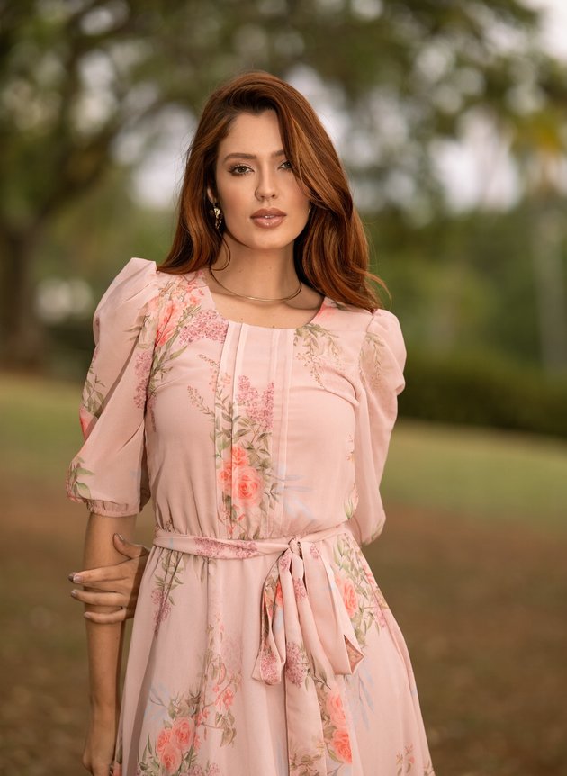 Vestido Marcia confeccionado em chiffon toque de seda, um tecido leve e com uma discreta transparência. Com decote arredondado possui pequena gota com fechamento em um botão madre perola, com duas pregas na altura do busto e centralizado ao corpo peça se encaixa perfeitamente, todo forrada em toque de seda trazendo conforto e segurança ao uso peça não possui abertura em zíper ou botões, porém com elástico na cintura facilitando a vestimenta, acompanha faixa para amarrações. Sua saia midi evasê, é leve e fluida, com uma manga ¾ peça possui uma velada transparência com franzido no ombro e acabamento no punho em elástico, sua estampa floral com cores que se complementam perfeitamente, em uma harmonia com a modelagem da peça.