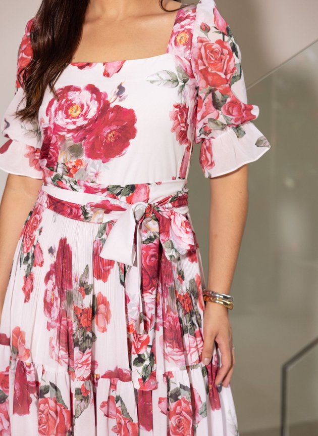 Vestido Laura confeccionada com mix de tecidos sendo no corpo toque de seda, sua saia e mangas em musseline Modelo com decote quadrado valorizando o colo feminino sendo na parte posterior das costas com amarração trazendo um toque de delicadeza para a peça. Modelo com mangas 3/4 com uma discreta transparência e acabamento em elástico com pequeno babado. Vestido todo forrado em toque de seda off-white um tecido leve e fluido perfeito para os dias mais quentes, sua cintura marcada acompanha faixa larga para amarrações. De fácil uso com zíper na lateral sua saia max midi possui um lindo plissado na primeira maria, sendo as outras em um recorte godê trazendo movimento e fluidez para o modelo, uma peça encantadora e cheia de elegância, sua estampa floral imponente trouxe personalidade ao vestido enquando o fundo off suavizou, a junção perfeita entre modelagem, tecido e estampa. O modelo perfeito para as festas que se aproximam. Para maior durabilidade da peça, evite o uso de alvejantes.