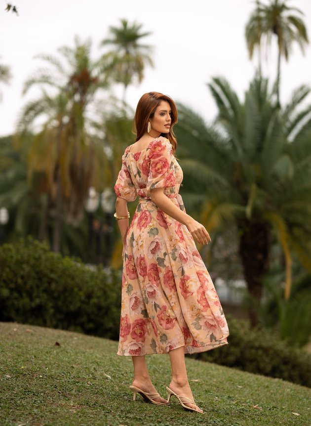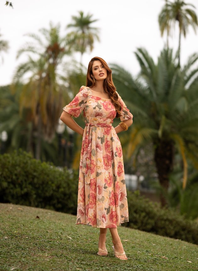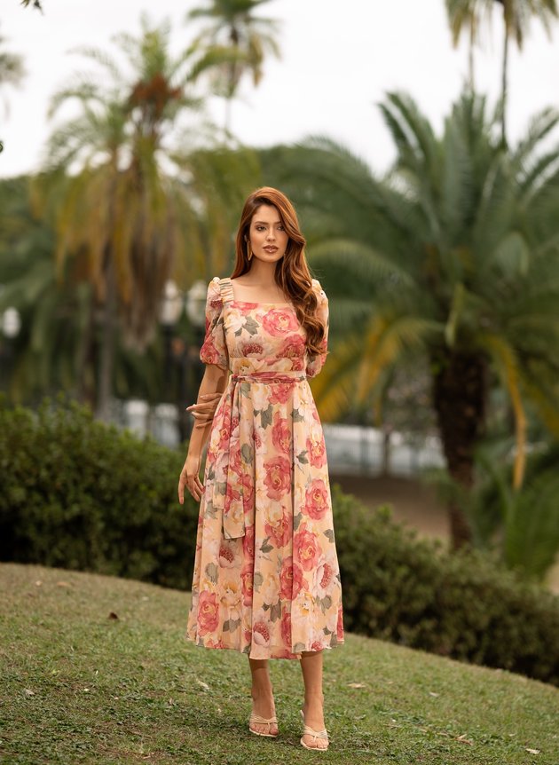 Vestido Yasmin confeccionado em chiffon toque de seda, um vestido encantador com seu decote quadrado e elástico nas laterais trazendo sustentação para o modelo, sua manga com uma discreta transparência possui um franzido na altura do ombro e acabamento no punho em elástico. Todo forrado em toque de seda trazendo conforto e segurança ao uso com duas pregas na altura do busto, uma pala na cintura que acompanha faixa larga para amarrações e zíper comum na lateral, destaque para sua saia max midi com godê duplo trazendo movimento e fluidez para a peça. Destaque para sua estampa floral aquarelada com cores que se complementam perfeitamente, um modelo atemporal e com cara de princesa perfeito para eventos especiais.