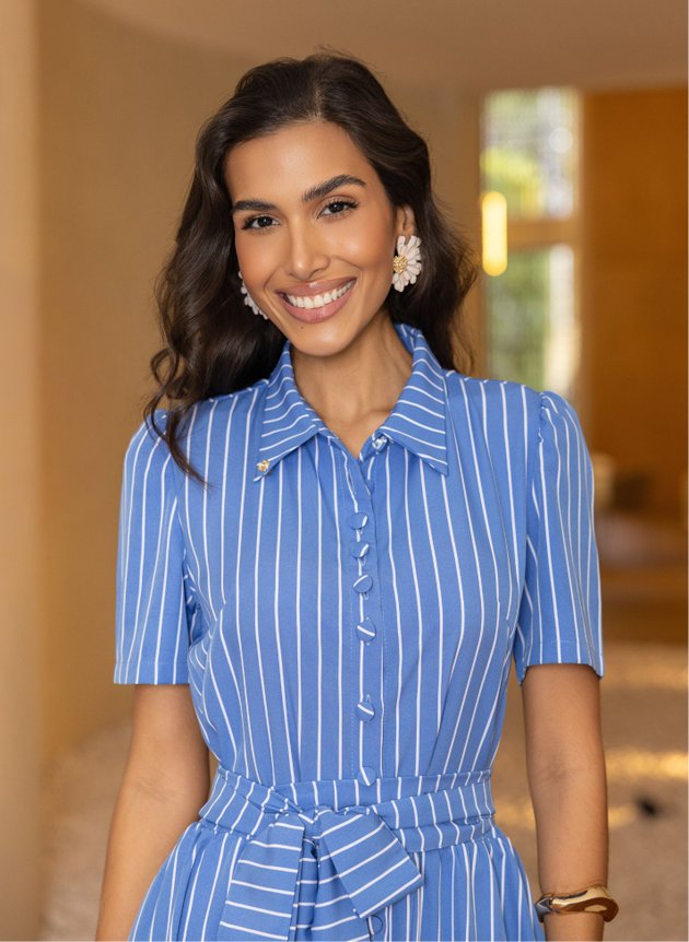 Vestido Helena confeccionado em camisaria spandex, um tecido mais estruturado perfeito para a proposta do look, modelo camisaria com gola costurada em tecido duplo e abertura em botões encapados por toda extensão da peça, com duas pregas na altura do busto se encaixa perfeitamente ao corpo, sua cintura marcada com elástico acompanha faixa para amarrações. Com uma manga estruturada possui pequenas pregas na altura do ombro e um lindo caimento sua saia com godê duplo toda forrada em helanca off-white trazendo conforto e segurança ao uso, ainda possui bolso faca embutido nas laterais trazendo funcionalidade à peça. Com uma pequena fenda na barra é uma peça cheia de conforto e estilo, podendo ser facilmente usada com rasteiras, saltos e tênis, se adequando a diversos estilos e a sua maior necessidade também. Uma peça atemporal que você vai amar ter no closet. Para maior durabilidade da peça, evite o uso de alvejantes.