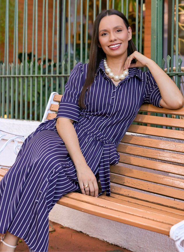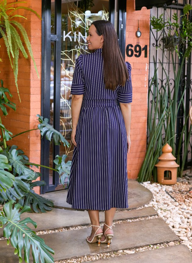 Vestido Luciana confeccionado em camisaria spandex, um tecido mais estruturado perfeito para a proposta do look, modelo camisaria com gola costurada em tecido duplo e abertura em botões encapados por toda extensão da peça, com duas pregas na altura do busto se encaixa perfeitamente ao corpo, sua cintura marcada com elástico acompanha faixa para amarrações. Com uma manga estruturada possui pequenas pregas na altura do ombro e um lindo caimento com punho largo, sua saia com godê toda forrada em helanca off-white trazendo conforto e segurança ao uso, ainda possui bolso faca embutido nas laterais trazendo funcionalidade à peça. Com uma pequena fenda na barra é uma peça cheia de personalidade e estilo, podendo ser facilmente usada com rasteiras, saltos e tênis, se adequando a diversos estilos e a sua maior necessidade também. Uma peça atemporal que você vai amar ter no closet. Seu tom azul escuro trouxe elegância para o modelo e um toque de imponência para o modelo que se tornou versátil e atemporal. Para maior durabilidade da peça, evite o uso de alvejantes.
