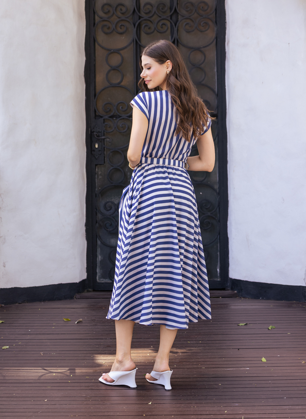 Vestido Heloisa confeccionado em toque de seda, um tecido leve e suave perfeito para os dias mais quentes, Modelo com decote gola boba valorizando o colo feminino, possui uma manga mais curtinha de modelagem reta, sua cintura marcada em elástico acompanha cinto encapado com fivela quadrada. Sua saia midi com modelagem godê é toda forrada em helanca branca trazendo conforto e segurança ao uso é uma peça fluida e de fácil uso, não possui abertura em zíper ou botões, destaque para sua estampa em listras azuis com off-white a composição perfeita para elaborar diversos look, ele vai bem com saltos, rasteiras ou tênis se adequando a sua maior necessidade.