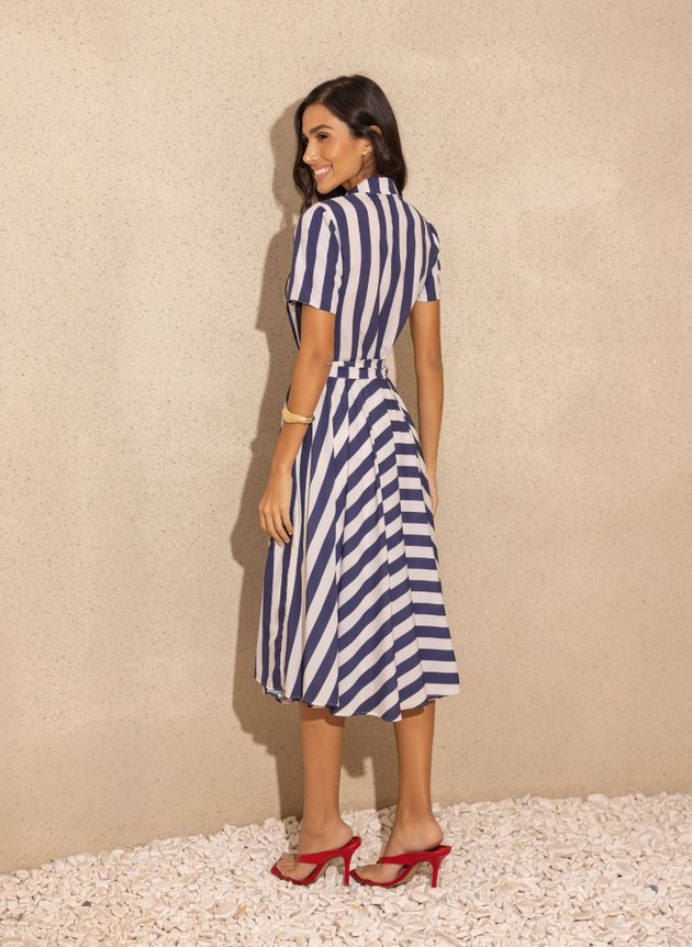 Vestido Valentina confeccionado em toque de seda um tecido leve, fluido e perfeito para estações mais quentes, modelo camisaria com gola costurada em tecido duplo e abertura em botões encapados por toda extensão da peça, com duas pregas na altura do busto se encaixa perfeitamente ao corpo, sua cintura marcada acompanha faixa para amarrações. Com uma manga costurada em tecido duplo trazendo sustentação e um lindo caimento e uma saia com godê duplo toda forrada em helanca off-white, com bastante fluidez e leveza essa peça é puro encanto. Cheia de conforto e estilo ela vai bem com rasteiras, saltos e tênis, se adequando a diversos estilos e a sua maior necessidade também. Uma peça atemporal que você vai amar ter no closet. Para maior durabilidade da peça, evite o uso de alvejantes.