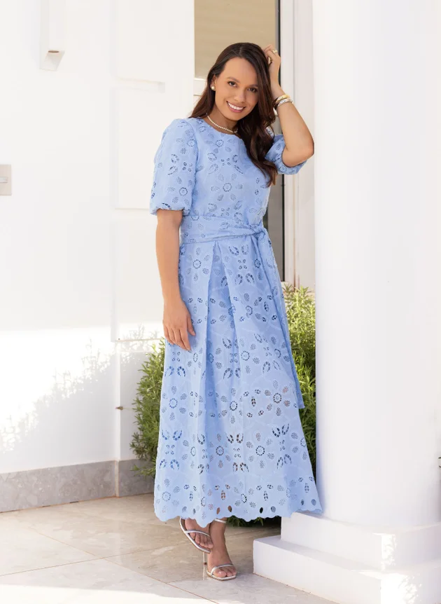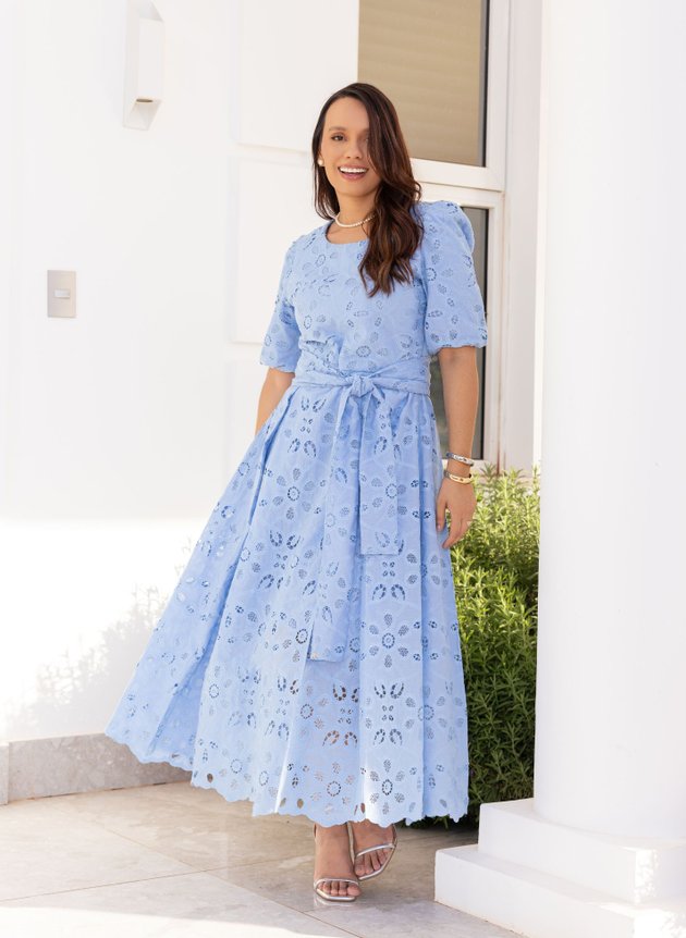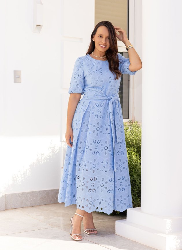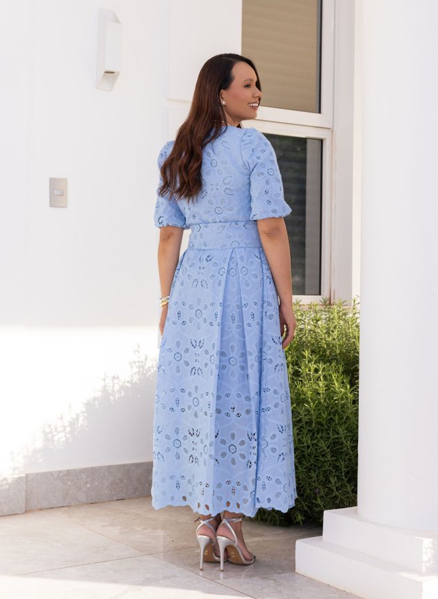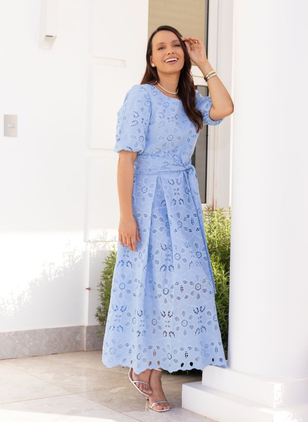 Vestido Elaine confeccionado em laise um tecido nobre e rico em detalhes com bordado à máquina. Modelo com decote arredondado e fechamento na parte posterior em uma gota e botão madre perola, com duas pregas na altura do busto se encaixando perfeitamente ao corpo com cintura marcada acompanha faixa larga para amarrações, sua manga ¾ com discreto franzido na altura do ombro e acabamento em punho de elástico deixando a manga princesa, um modelo encantador e rico na sua modelagem bem estruturada. Sua saia longuete toda costurada em pregas largas traz um caimento perfeito para o modelo, sua cor azul trouxe serenidade para o modelo que foi desenvolvido para momentos especiais, uma peça que exala sofisticação, perfeita para as festas e eventos. De fácil uso possui abertura em zíper comum na lateral, todo forrado em cotton voile no mesmo tom de azul da peça trazendo conforto e segurança ao uso. Por ser uma peça mais sofisticada pedimos que ao usar acessórios tenham cuidado para não danificar à peça. Para maior durabilidade do produto evite o uso de alvejantes.