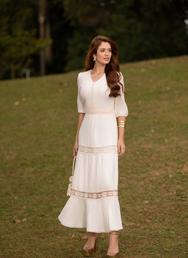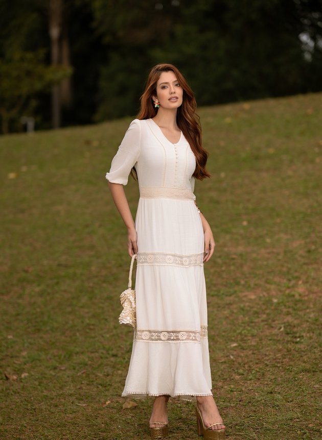 Vestido Talita confeccionado em Oasis um tecido que possui fibras naturais do próprio tecido, com decote em V valorizando o colo feminino, todo costurado em tecido duplo na parte anterior com recorte, entremeio palito e abertura em botões encapados até a altura da cintura. De fácil uso possui abertura em zíper comum na lateral, sua cintura marcada em uma pala possui sobreposição de aplique, seu comprimento longo traz uma elegância extra para o look com recortes na saia peça é forrada em helanca off trazendo conforto e segurança ao uso. Com acabamento na barra em aplique também, sua manga ¾ com acabamento no punho em elástico é perfeito para que gosta de mangas mais alongadas. Um modelo rico em detalhes, que combina sofisticação e suavidade do tecido natural que amamos. Ele vai bem em ambientes mais formais ou mais casuais, elabore composições que mais se adeque a sua necessidade e monte várias propostas de looks com um único vestido.