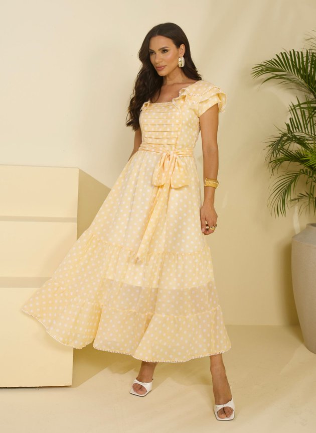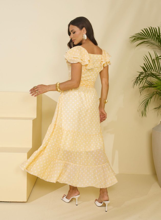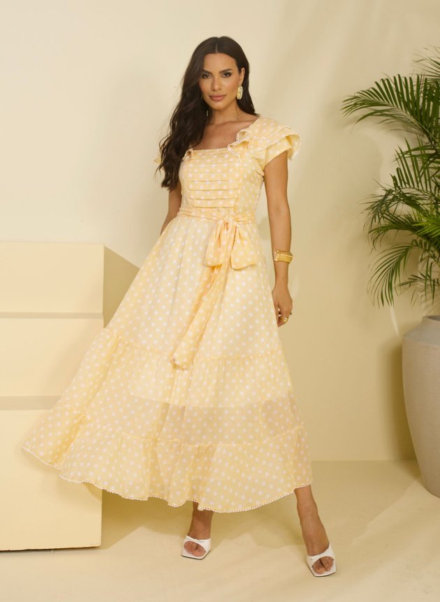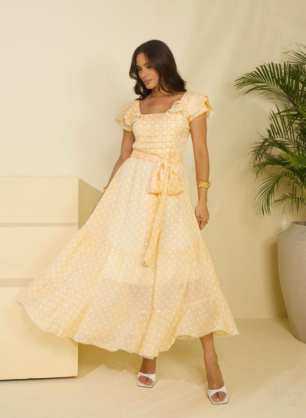 Com comprimento max midi, a saia é forrada em helanca evasê, com duas maria em um barrado no godê que trazem movimento e fluidez ao look. Este vestido é repleto de detalhes encantadores, com destaque para a manga sobreposta, que possui dois babados e acabamento em aplique, acrescentando delicadeza e romantismo ao modelo. Trata-se de uma peça verdadeiramente encantadora, confeccionada com modelagem e tecidos de primeira linha, perfeita para diversas ocasiões especiais.