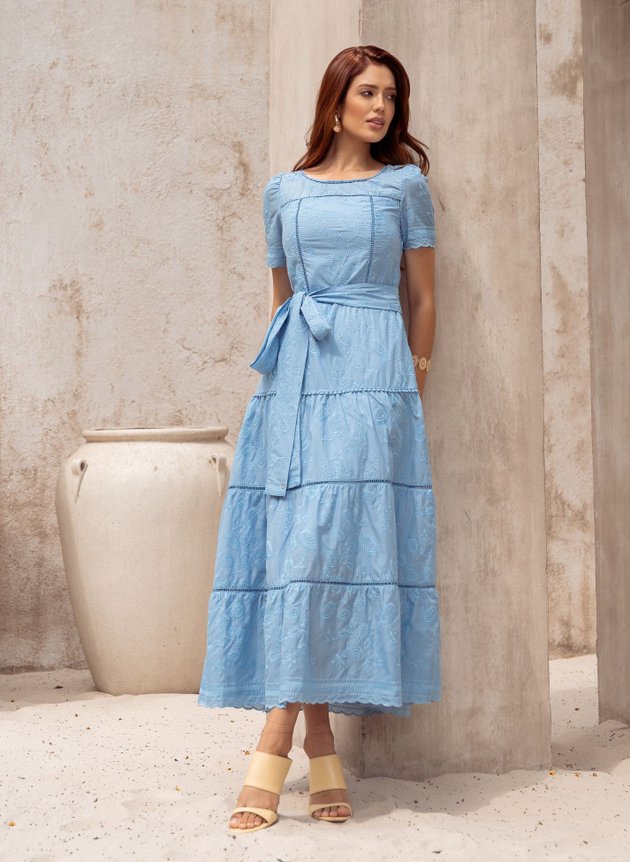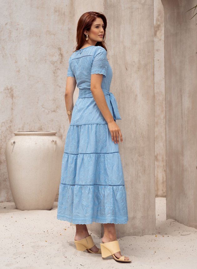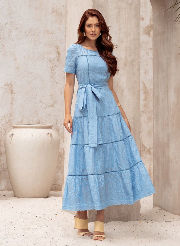 Vestido Glória confeccionado em tecido de algodão, com decote arredondado e aplicação de poá o fechamento posterior é com botão madre pérola, o corpo da peça todo costurado em recortes com entremeio palito trazendo uma sofisticação e encaixe perfeito ao corpo, sua manga mais retinha possui acabamento com aplicação de poá na barra trazendo um romantismo pra peça. De fácil uso com abertura em zíper comum na lateral, cintura marcada acompanha faixa para amarrações, de comprimento Maxi Midi possui três Marias, a primeira com aplicação de poá e as outras duas com entremeio palito e a barra com acabamento da própria laise, peça toda forrada trazendo conforto segurança ao uso, uma peça sofisticada e elegante podendo ser usada em diversas ocasiões. Para o bom uso da peça não usar alvejantes.