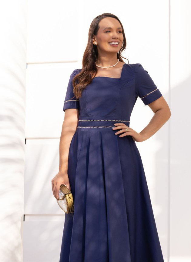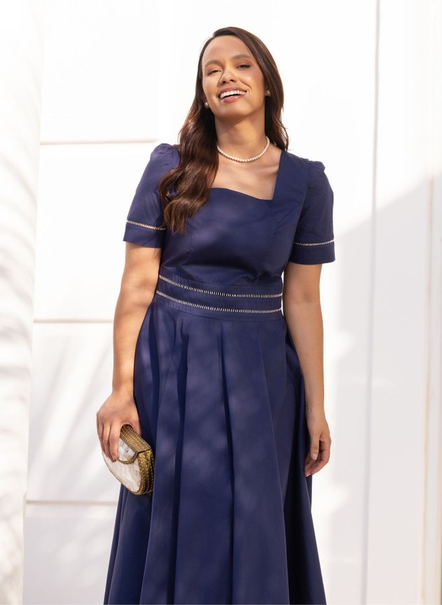 Vestido Natalia confeccionado em tricoline um tecido mais estruturado e com caimento, modelo com decote quadrado, recortes na parte do corpo se encaixando perfeitamente e todo costurado em tecido duplo. Sua manga mais alongada com pequeno franzido na altura dos ombros possui acabamento em punho duplo e aplicação de entremeio palito na cor cru, sua cintura marcada por uma pala larga também possui aplicação de entremeio trazendo um charme extra ao modelo. De fácil uso com zíper comum lateral é uma peça rica em detalhes. Sua saia maxi midi toda forrada em helanca na cor preta traz conforto e segurança ao uso, sua modelagem ampla com recortes e um barrado largo se completam com a assimetria trazendo modernidade ao look que reúne elegância e sofisticação em seu tom azul escuro da tricoline. Um modelo atemporal que pode ser usado em diversas ocasiões e estações do ano. Para maior durabilidade da peça, evite o uso de alvejantes.