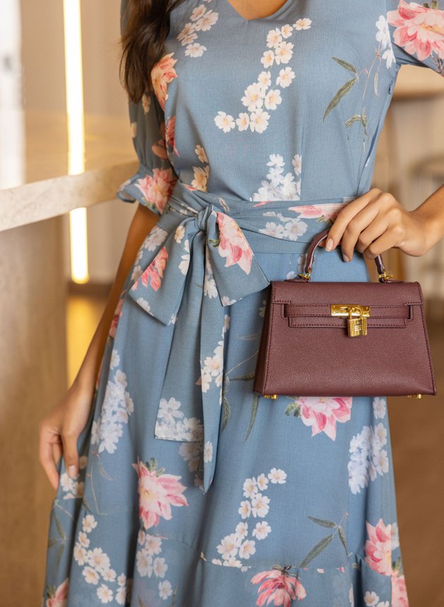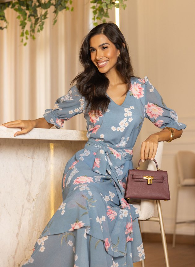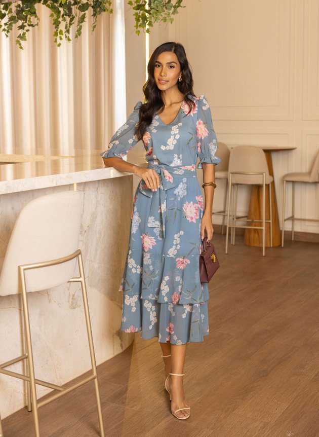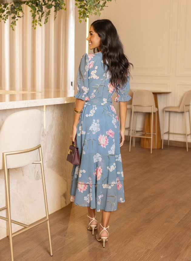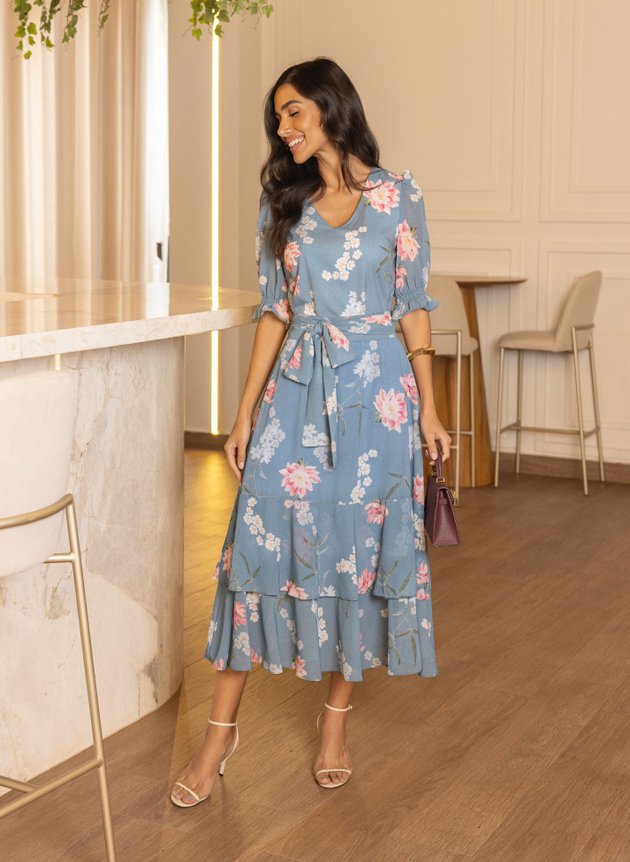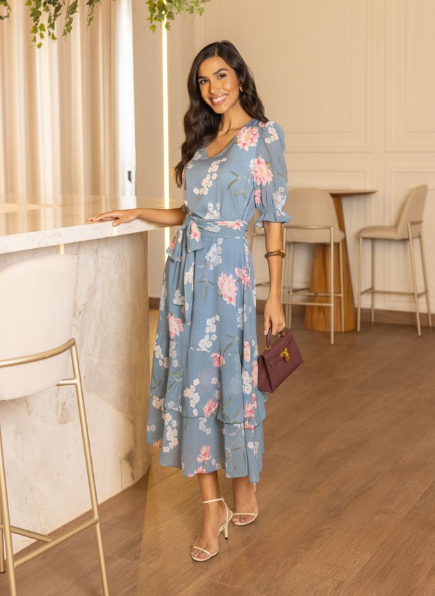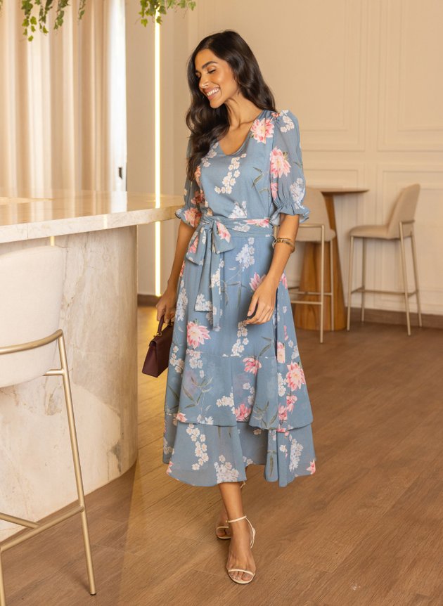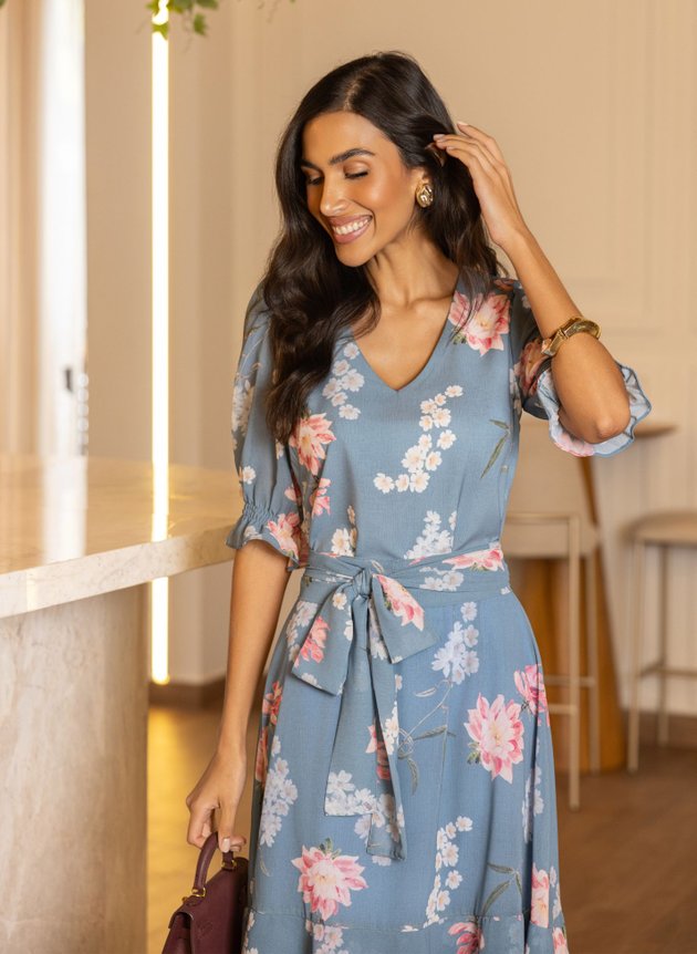 Vestido Laiz confeccionado com mix de tecidos ambos com toque de seda, leveza e fluidez. Modelo com decote em V valorizando o colo feminino, todo costurado em tecido duplo na parte anterior, com duas pregas na altura do busto sua cintura marcada acompanha faixa larga para amarrações, de fácil uso possui abertura em zíper comum na lateral, corpo da peça todo em toque de seda. Sua saia toda confeccionada em chiffon de comprimento max midi, começa evasê e termina em um recorte godê na barra com babado sobreposto, trazendo movimento e fluidez para a peça. Sua manga ¾ também confeccionada em chiffon com uma discreta transparência possui um franzido na altura do ombro e acabamento em lastex no punho com pequeno babado, sua saia toda forrada em toque de seda na cor azul traz ainda mais conforto e segurança ao uso. Destaque para sua estampa floral com cores suaves que casaram perfeitamente com fundo azul da peça que possui um trabalhado de textura na própria estampa, a composição perfeita para a proposta do look, atemporal e elegante ele é a peça perfeita para eventos, formaturas, aniversários e casamentos. Para maior durabilidade da peça, evite o uso de alvejantes.