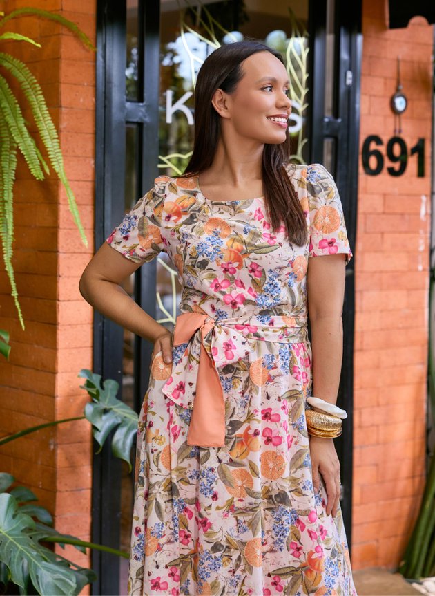 Sua saia maxi midi evasê é toda forrada em helanca, de modelagem evasê com barrado largo no godê trazendo movimento e fluidez. Uma peça atemporal, com a cara da estação em tecido leve e fluido com uma estampa exclusiva, ainda possui bolso faca embutido nas laterais. Uma linda peça que pode ser usada em diversas ocasiões, sejam mais formais ou mais casuais.