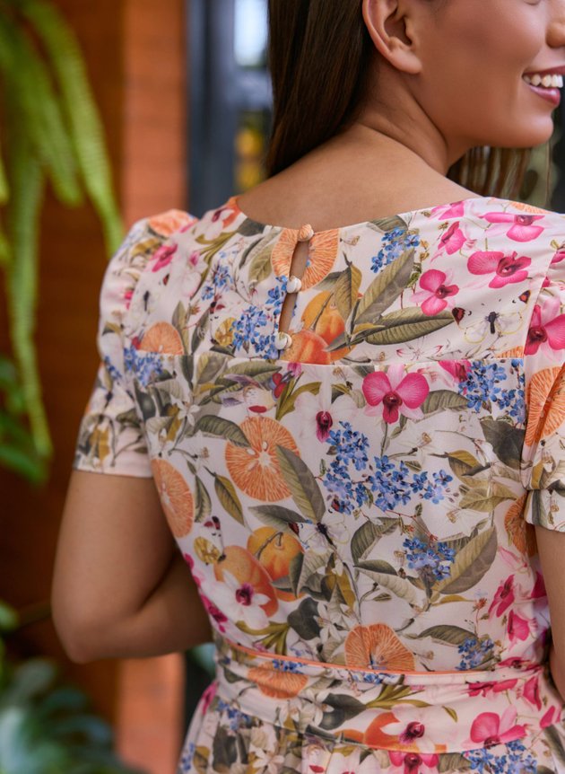 Peça possui fechamento na lateral em zíper comum, acompanha faixa dupla sendo um lado estampado e o outro na cor laranja, trazendo um toque fashionista para o look, você pode usa-la dos dois lados.