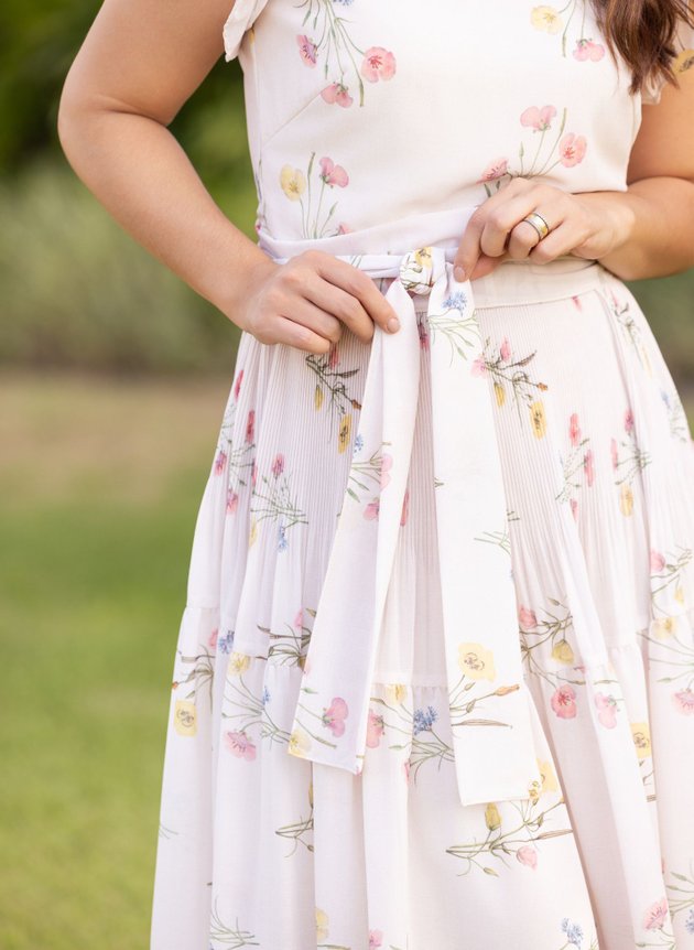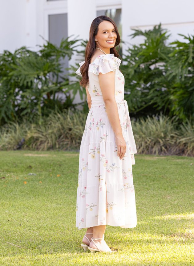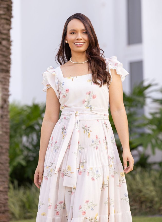 Vestido Marli confeccionado em tecido de musseline com toque de seda é um tecido leve e fluido, com decote quadrado desenhando o colo feminino peça possui duas pregas na altura do busto trazendo um encaixe perfeito ao corpo, todo forrado em toque de seda possibilitando conforto e segurança ao uso. Com abertura em zíper comum na lateral, sua cintura marcada acompanha faixa larga para amarrações, cheia de delicadeza e romantismo sua manga em um babado duplo franzido a peça tem um toque romântico em cada detalhes, de comprimento maxi midi ele é todo plissado no primeiro recorte das marias trazendo sofisticação para o modelo que exala requinte, com um caimento impecável a segunda maria da saia foi toda costurada no franzido sendo a última com recorte godê o que traz movimento e fluidez para a peça. Sua estampa floral reúne elementos de cores que se complementam, uma peça elegante desenhada e modelada para momentos especiais. Elegante e com suavidade que as festas de fim de ano pedem, ele é um modelo atemporal perfeito para diversas ocasiões. Para maior durabilidade da peça, evite o uso de alvejantes.