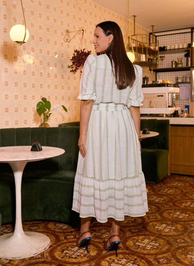 Modelo com saia maxi midi, de modelagem evasê com recorte na barra em um barrado largo franzido, é toda forrada em helanca off, ainda possui bolso faca embutido nas laterais. Destaque para a delicadeza do seu tom verde nas listras, delicado e atemporal. Sua manga ¾ com um discreto franzido na altura dos ombros e acabamento em elástico no punho. Cores mais suaves vem ganhando espaço nos closet, sejam elas mais formais ou mais casuais trazem uma leveza para o look, podendo usar e abusar dos acessórios para melhor combinar com sua personalidade.