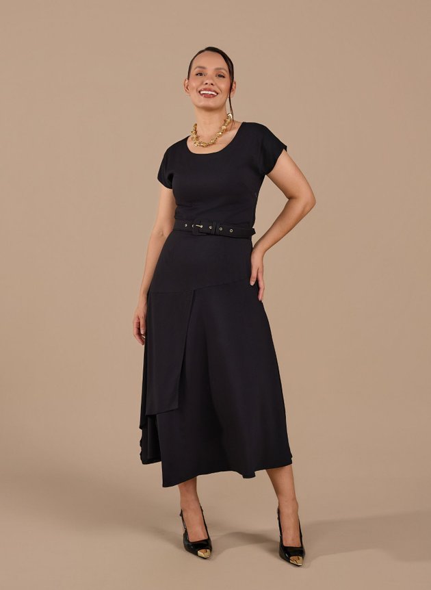 Vestido Aline confeccionado em visco twill um tecido bem confortável e maleável, perfeito para dias mais quentes. Modelo com decote arredondado, manga japonesa e todo costurado em tecido duplo no corpo trazendo conforto e um caimento mais bonito à peça, com duas pregas na altura do busto, sua cintura marcada acompanha cinto encapado de mesmo tecido de cor da peça. De fácil uso vestido possui abertura em zíper comum na lateral, sua saia max midi toda forrada em helanca preta possui um recorte com sobreposição e barrado assimétrico trazendo um toque de estilo e modernidade ao look. Aquele pretinho nada básico para qualquer ocasião.