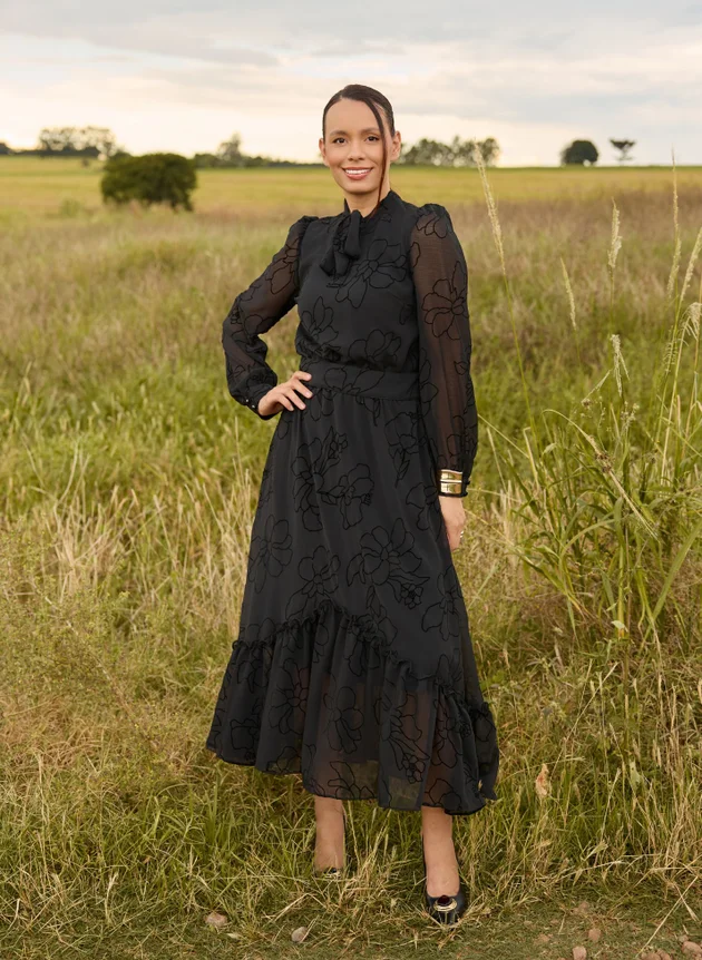 Vestido Erika confeccionado em Chiffon um tecido bem leve e fluido, modelo gola laço com decote em V, mais soltinho com duas pregas na altura do busto se ajusta perfeitamente ao corpo. Sua cintura marcada em elástico acompanha uma faixa cinto com fechamento em grupo de três botões. Sua saia maxi midi evasê possui um recorte no barrado em godê franzido trazendo mais movimento para o modelo, todo forrado em toque de seda na cor preta trazendo conforto e segurança ao uso. Sua manga longa com uma discreta transparência do próprio tecido, possui franzido na altura do ombro e acabamento em punho com fechamento em grupo de dois botões madre perolas. Uma peça elegante e cheia de sofisticação, detalhe para os desenhos em veludo no tecido trazendo um charme extra ao look.