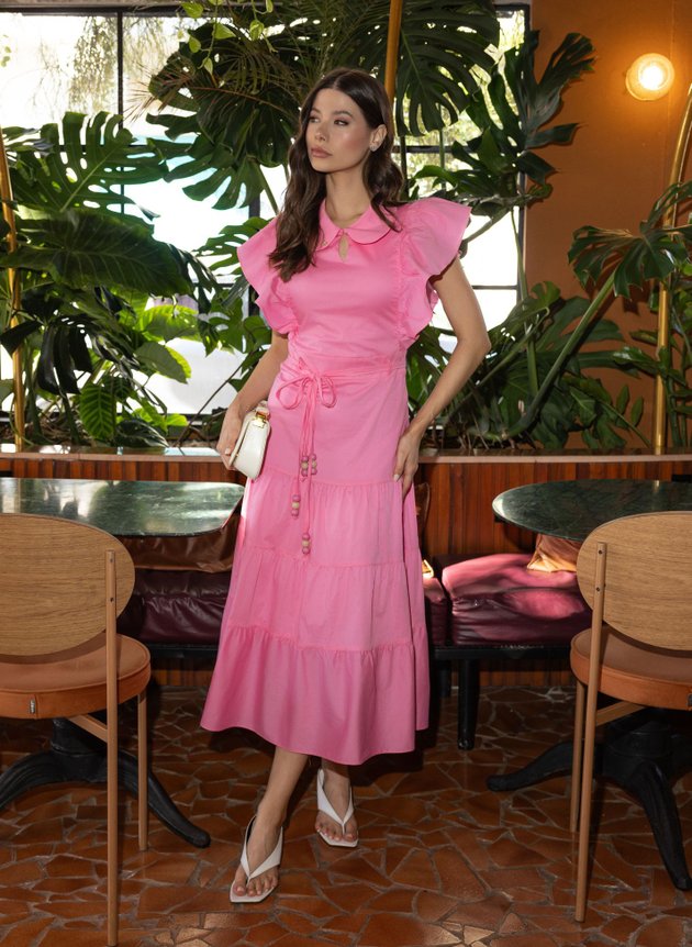 Vestido Ana na cor rosa confeccionado em tricoline um tecido mais estruturado, modelo com gola arredondada costurada em tecido duplo com fechamento em um botão encapado e pequena gota, modelo com manga mais curtinha perfeita para os dias mais quentes, de fácil uso possui abertura em zíper comum na lateral. O charme da peça com certeza são seus babados laterais sobrepostos, muito bem estruturados deixando a peça com cara de boneca, para as amantes de look delicados e românticos o vestido Ana é a definição perfeita. Com cintura marcada em uma pala, peça acompanha duas fitas cinto com acabamento em perolas marmorizadas na ponta em um acabamento encantador. Seu comprimento Max midi Costurado em três marias no godê franzido trazem um caimento mais amplo para a peça, sua saia foi toda forrada em helanca off-white trazendo conforto e segurança ao uso.