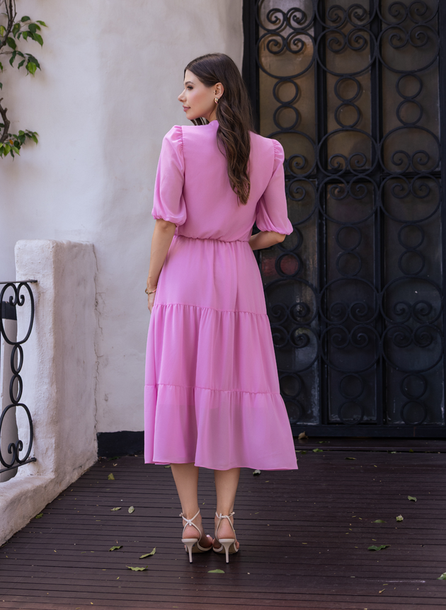 Vestido Caroline confeccionado em tecido de chiffon toque de seda, um tecido leve e fluido com uma discreta transparência. Modelo gola padre com amarração de fita e acabamento em ponteira no dourado, com decote em V valorizando o colo feminino peça possui abertura em botões encapados até a altura da cintura, destaque para as flores laterais aplicadas a peça que podem ser removidas. Vestido com cintura marcada em elástico acompanha faixa para amarrações, com duas pregas na altura do busto se ajusta perfeitamente ao corpo, sua manga ¾ com franzido no ombro uma velada transparência possui punho em elástico. Modelo midi com saia evasê em três marias trazendo um caimento impecável ao look, todo dourado no corpo e saia em toque de seda na cor rosa trazendo conforto e segurança ao uso, é uma peça delicada e atemporal com seu tom rosa que vai ganhar espaço nessa nova temporada, uma aposta sem erro.