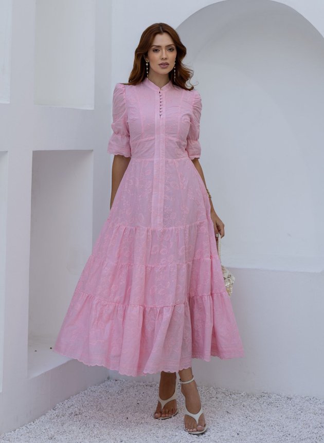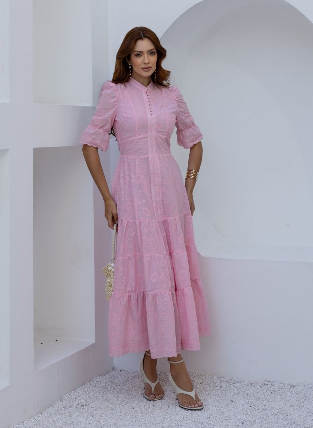 Vestido Marina na cor rosa confeccionada em laise um tecido nobre todo bordado a máquina, elegante e sofisticado com gola padre possui abertura em botões encapados na parte anterior e zíper comum na lateral modelo todo forrado no corpo costurado em recortes que se encaixam perfeitamente ao corpo. Sua cintura marcada em uma pala modela o corpo com acabamento nas costas em elástico, sua saia max midi evasê com um recorte e um barrado em três marias no godê trazendo movimento à peça em um caimento perfeito é um vestido sofisticado, romântico e atemporal, sua manga ¾ com franzido na altura dos ombros acabamento em elástico e pequeno babado é perfeita para a proposta do look. Para maior durabilidade da peça, evite o uso de alvejantes.