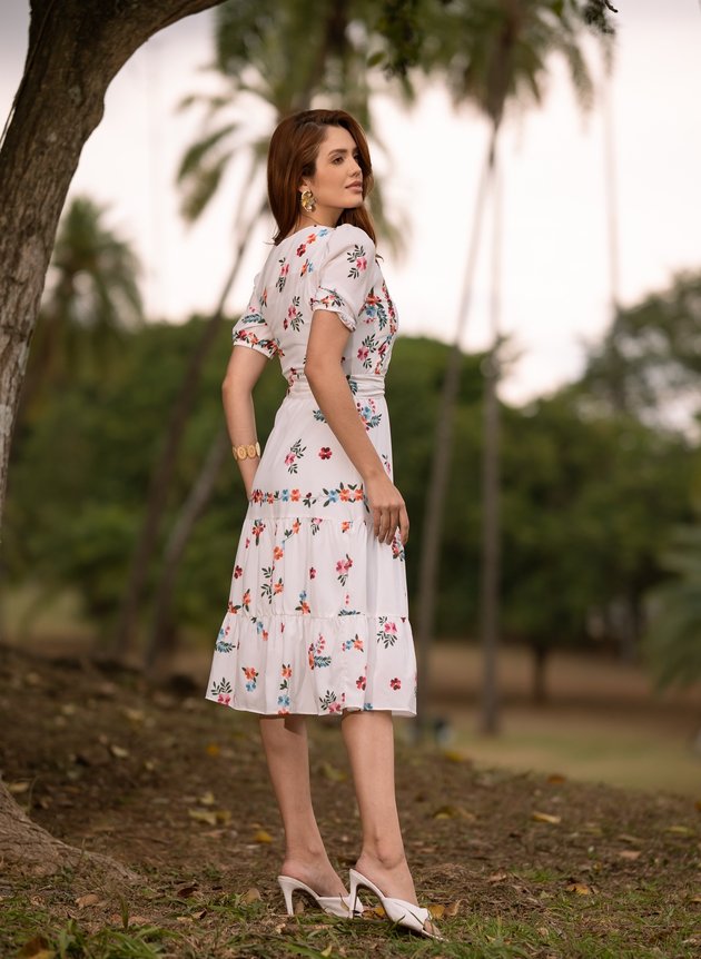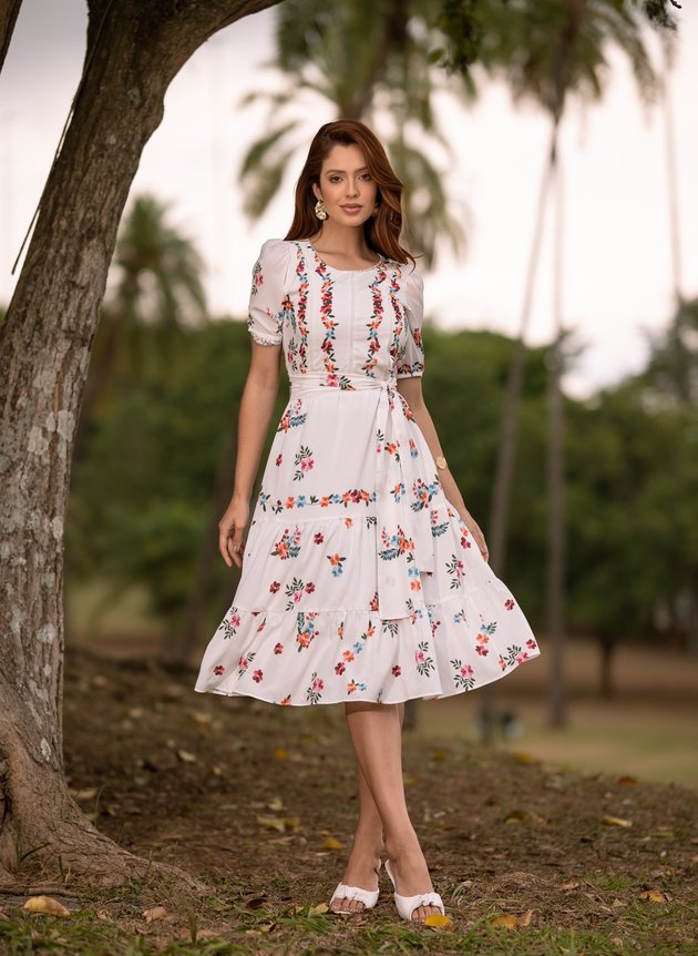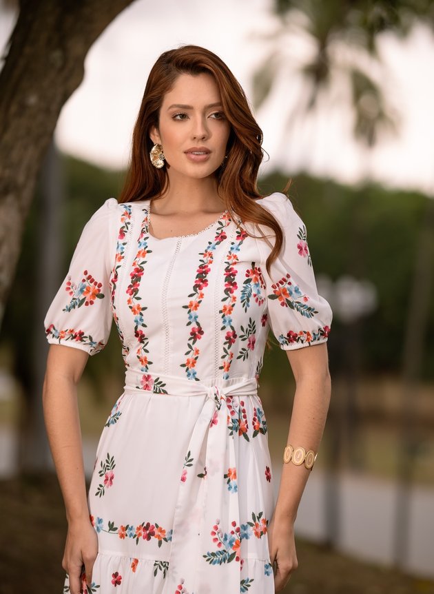 Vestido Maria off confeccionado em toque de seda um tecido leve e fluido, perfeito para o verão. Com decote arredondado é todo costurado em tecido duplo na parte anterior do corpo, com recortes e aplicação de entremeios se encaixa perfeitamente ao corpo, de fácil uso com abertura em zíper comum na lateral. Sua cintura marcada acompanha faixa larga para amarrações, sua saia evasê também com recortes possui duas marias no franzido trazendo movimento para a peça, toda forrada em helanca off-white. Destaque para sua estampa floral que mais parece um bordado industrial, delicado e rico em detalhes possui uma manga mais alongada com franzido na altura do ombro e acabamento em elástico no punho, para quem ama peças mais delicadas e com toque romântico esse modelo é perfeito.