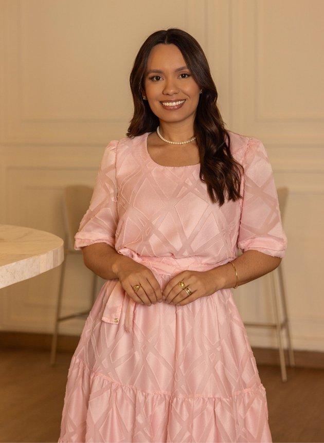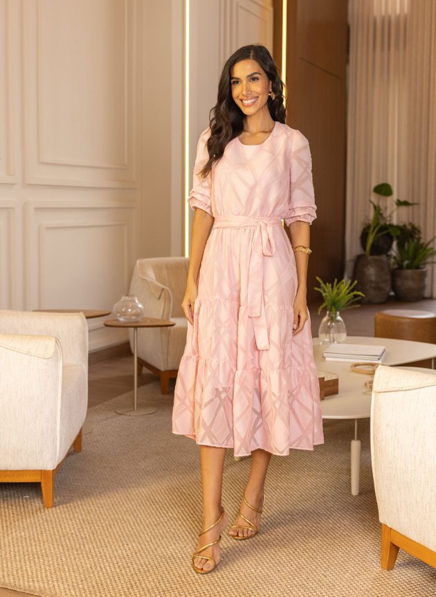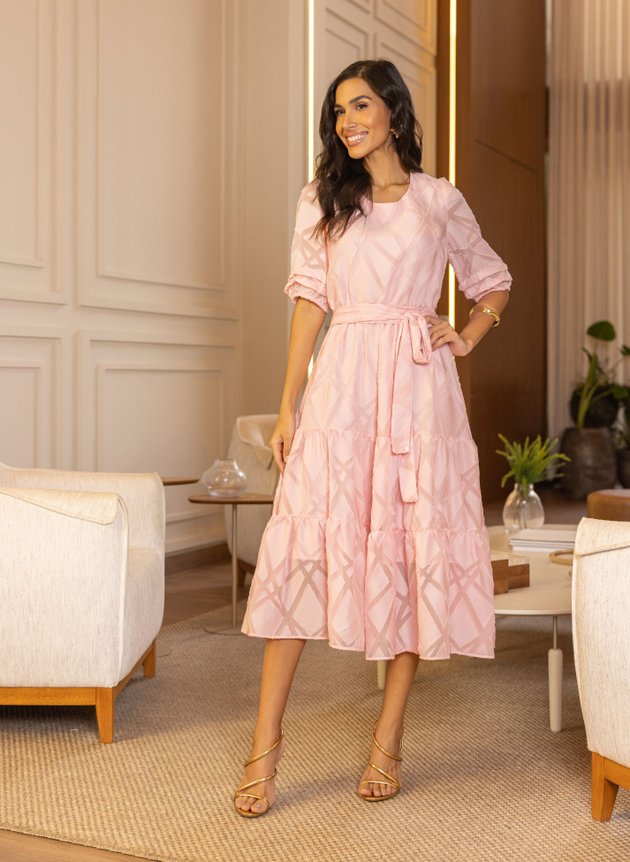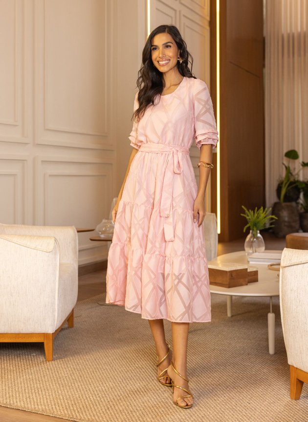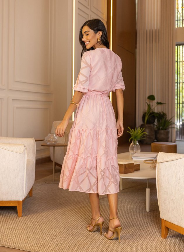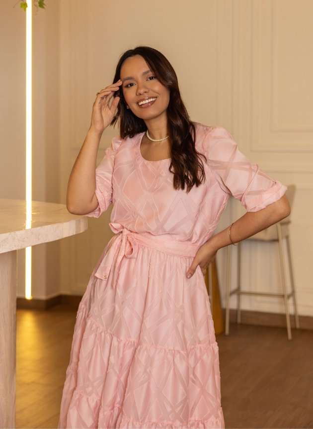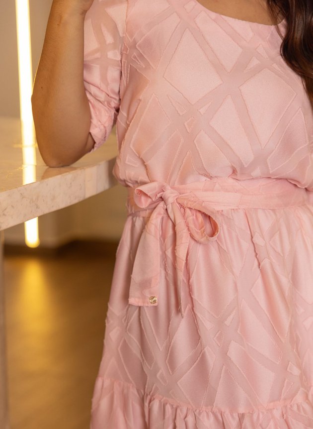 Vestido Valeria confeccionado em Chiffon geométrico um lindo tecido, leve e com alto relevo em formas geométricas, trazendo uma textura linda para o tecido. Modelo com decote arredondado, corpo todo forrado em toque de seda na cor rosa, trazendo conforto e segurança ao uso. Sua manga possui uma discreta transparência com duas pregas próximas ao punho que possui acabamento em elástico, peça não possui abertura em zíper ou botões porém seu elástico na cintura facilita a vestimenta, acompanhando uma faixa para amarrações. Destaque para sua saia que começa evasê e termina no godê franzido em duas marias com um caimento impecável é uma peça bem fluida e leve, seu tom rosa claro trouxe suavidade e leveza para o modelo que pode ser usado em diversas ocasiões sejam elas mais formais ou mais casuais, atemporal é uma aposta sem erro para quem ama estar bem vestida com peças únicas. Para maior durabilidade da peça, evite o uso de alvejantes.