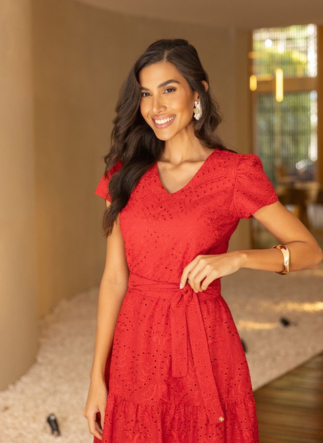 Vestido Eloa confeccionado em laise com decote em v valorizando o colo feminino, corpo da peça com duas pregas na altura do busto, abertura em zíper comum na parte posterior das costas e corpo todo forrado em toque de seda vermelho. Sua cintura marcada acompanha faixa para amarrações em uma saia que começa evasê e termina no godê franzido em um barrado largo trazendo movimento para a peça, sua manga mais curtinha costurada em tecido duplo com pequenas pregas na altura do ombro trazendo sustentação para o modelo, toda elegância da laise em um vestido que exala sofisticação e a imponência do vermelho que amamos, perfeito para os eventos de fim de ano que se aproxima. Para maior durabilidade da peça, evite o uso de alvejantes.